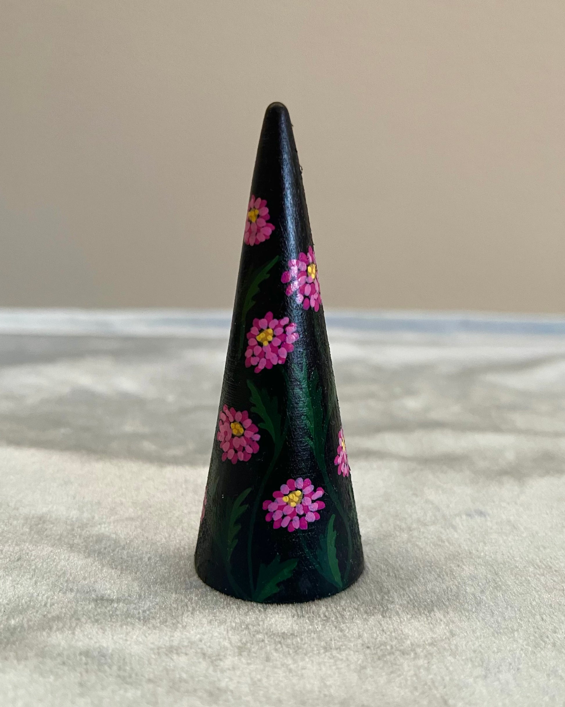 Handpainted wooden ringcone with pink flowers.